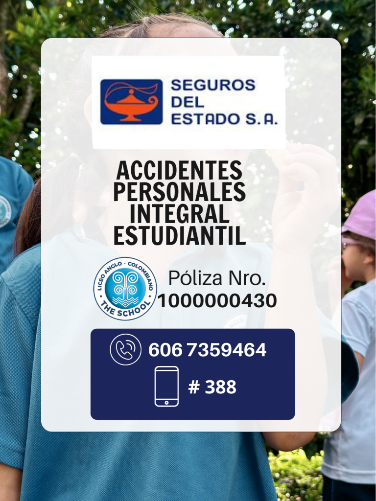 En el evento de tener un accidente donde sea afectado un estudiante del colegio estos son los pasos a seguir: No 1 notificar a las autoridades del colegio. No 2 es notificar al seguro. No 3 hacer clic en el icono de seguros del estado (abajo)